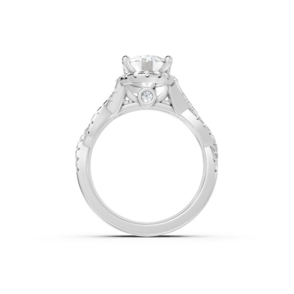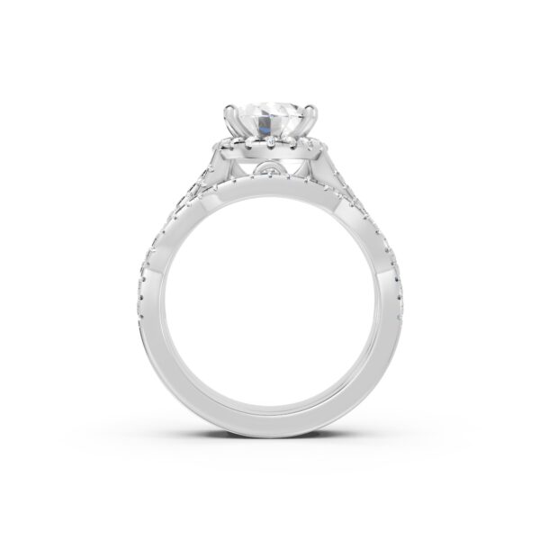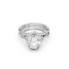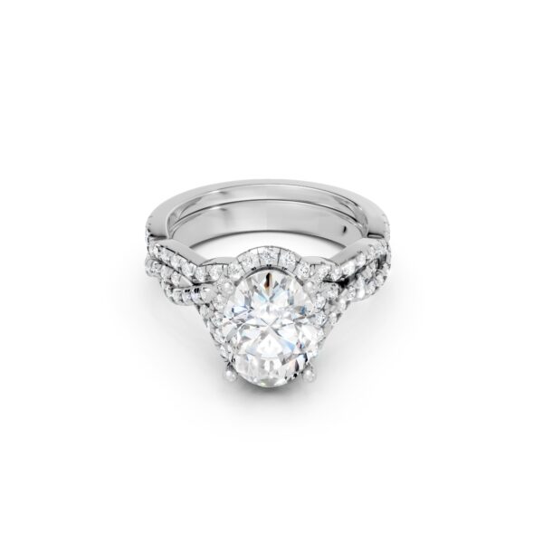 Symbolic and striking, this engagement ring features an oval center stone set atop an intertwined double pavé band, representing two paths united as one. The flowing design adds depth, texture, and continuous sparkle while maintaining a graceful profile. A meaningful statement crafted to endure for generations. This set includes the engagement ring and a matching band as well.