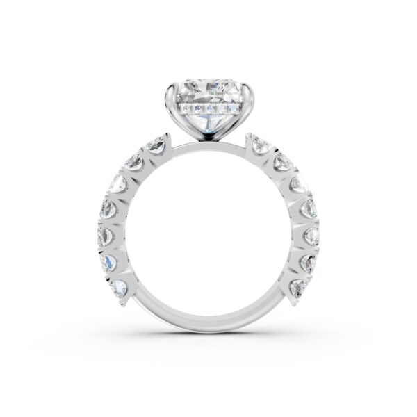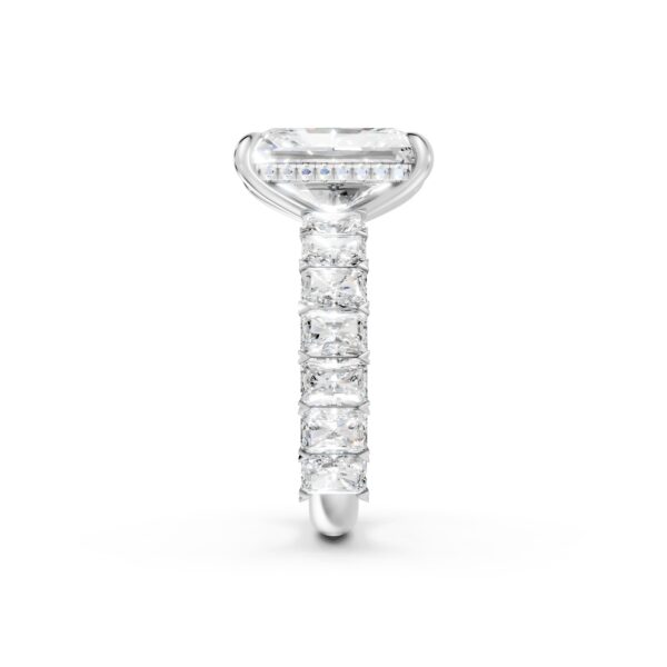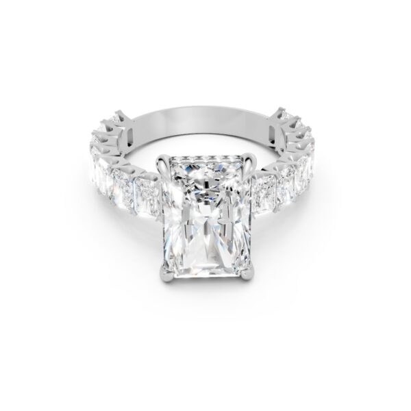 A celebration of symmetry and precision, this radiant-cut engagement ring is framed by meticulously set radiant side stones that enhance its brilliance from every angle. The structured layout delivers a sleek, contemporary look while maintaining timeless elegance. Designed for those who appreciate detail, balance, and exceptional craftsmanship.