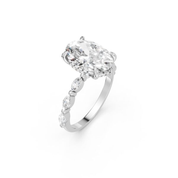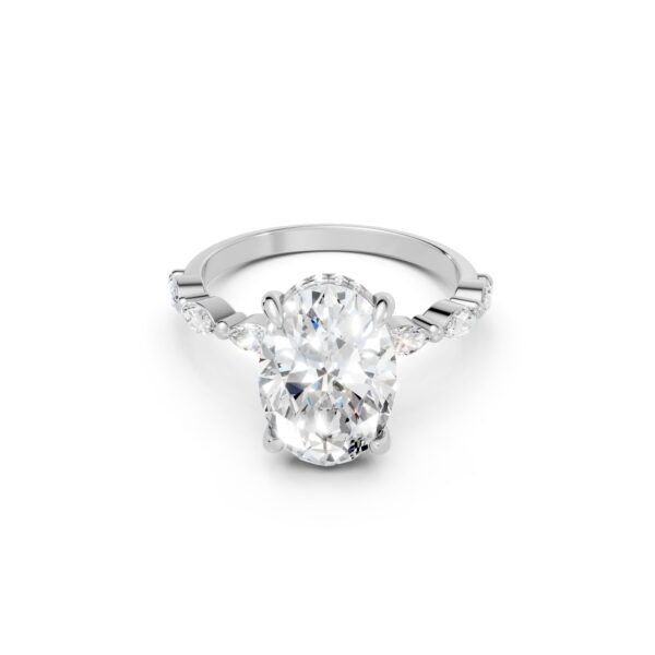Distinctive by design, this engagement ring features an oval center stone accented by three marquise diamonds on each side, creating graceful movement and visual intrigue. The tapered side stones draw the eye inward, enhancing the center stone’s presence. A bold yet elegant choice for those seeking something truly unique.