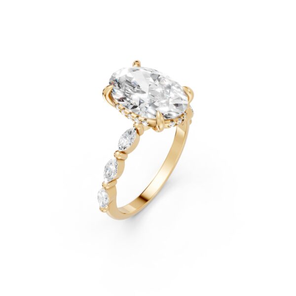 Distinctive by design, this engagement ring features an oval center stone accented by three marquise diamonds on each side, creating graceful movement and visual intrigue. The tapered side stones draw the eye inward, enhancing the center stone’s presence. A bold yet elegant choice for those seeking something truly unique.